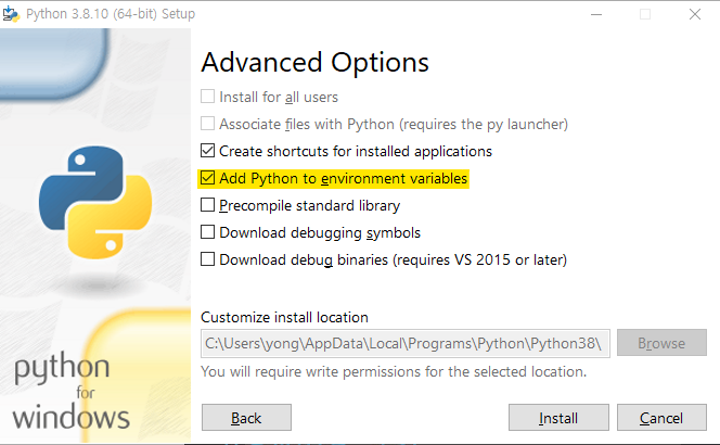+) cmd에서 python이라고 입력을 했는데도 아무 반응이 없다면? python 설치 시 Add Python 3.8 to PATH를 하지 않아 발생하는 일입니다. 당황하지 마시고 python 설치를 진행했던 exe 파일을 실행 후 Modify > Next > Add Python to environment variables를 체크하고 > Install 하고 다시 cmd에서 python을 입력해보세요!