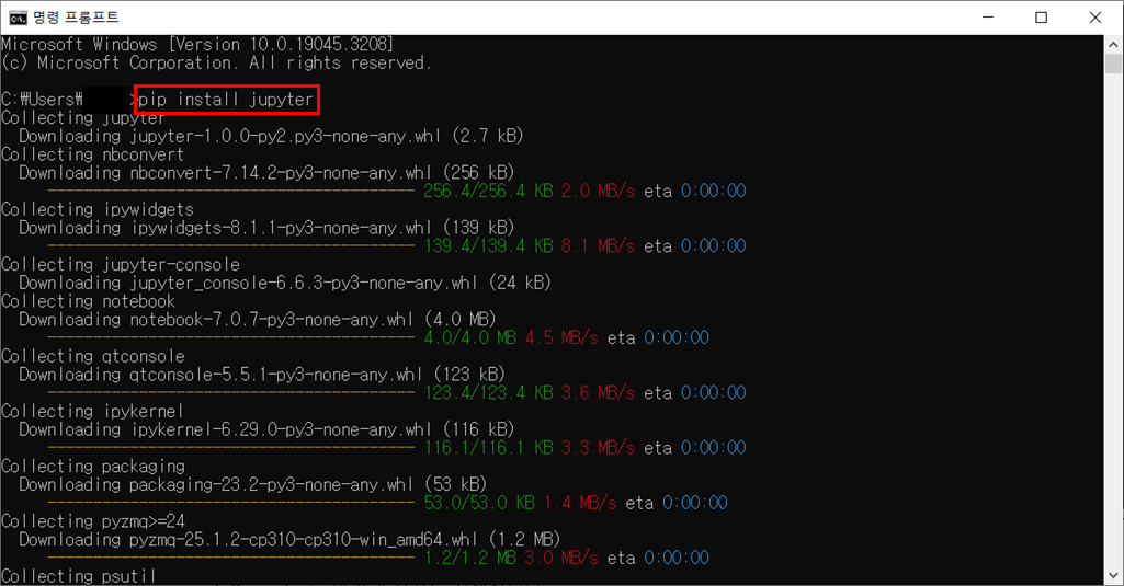 2. pip install jupyter를 입력해 설치를 진행합니다.