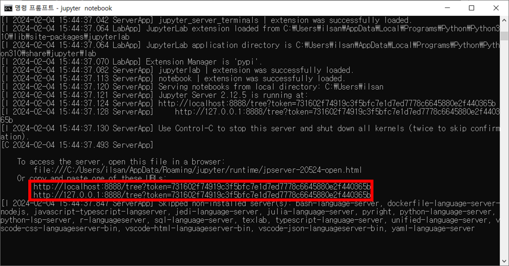 +) jupyter notebook이 실행된 인터넷 창을 실수로 닫아버렸을때, jupyter notebook 명령어를 입력한 cmd창으로 가서 link를 카피해 주소창에 입력하면 다시 jupyter notebook을 켤 수 있습니다.